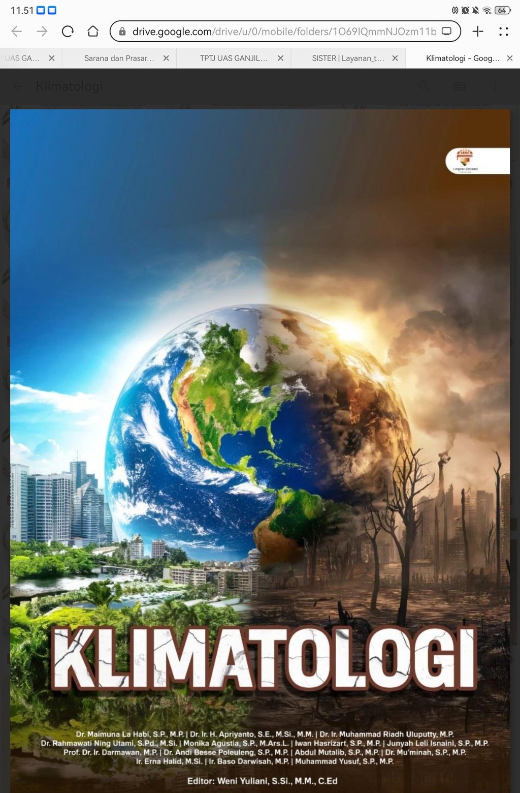 Materi buku (Bab): 1. Batasan dan ruang lingkup 2. Unsur cuaca dan iklim 3. Kegunaan klimatologi dalam bidang pertanian 4. Tujuan Klimatologi Pertanian 5. Neraca radiasi dan neraca kalor (Monika Agustia, S.P., M.Ars.L) 6. Intensitas radiasi surya dan pertumbuhan tanaman 7. Kualitas radiasi surya dan pertumbuhan tanaman 8. Hubungan energi cahaya terhadap pertumbuhan tanaman 9. Penetrasi radiasi dalam kanopi tanaman 10. Faktor-faktor yang mempengaruhi suhu tanah 11. Pengaruh suhu tanah terhadap pertumbuhan tanaman (Dr. Mu'minah, S.P., M.P.) 12. Suhu udara dan pertumbuhan tanaman (Ir. Erna Halid, M.Si) 13. Modifikasi suhu udara dan suhu tanah 14. Peran ekologi tumbuhan dalam keberlanjutan lingkungan